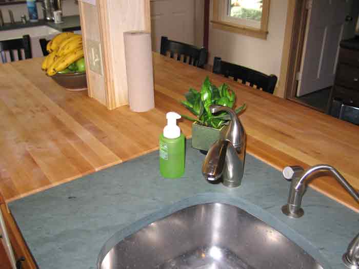 Thoughts on Counters In the last few years, I’ve become enamored of undermount sinks. It’s so much more convenient to be able to just sweep water and debris into the sink, rather than have to contend with the rim of conventional drop-in sinks. And they look really neat. You can undermount a sink in a wood top, and we have, but a waterproof material works much better. The photo shows a counter of Vermont slate, made by Vermont Stone Arts, in Barre, Vermont. I like slate, and also soapstone, much better than granite- which feels cold to me, particularly in large quantities. We’ve also made several counters out of old-fashioned linoleum, bonded to plywood, with a wood edge. Marmoleum makes this product in many patterns. It is made from jute, stone dust, linseed oil, and other natural materials. It’s rugged, and somewhat heat resistant. I like it because it’s softer,warmer, and more forgiving than laminate. Many people like that it’s a natural product.