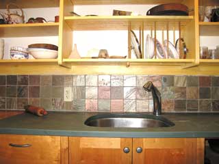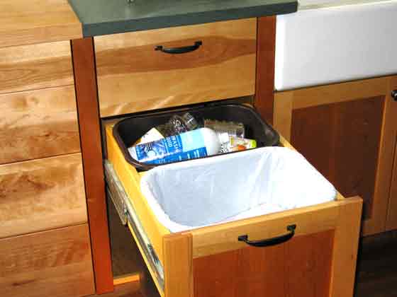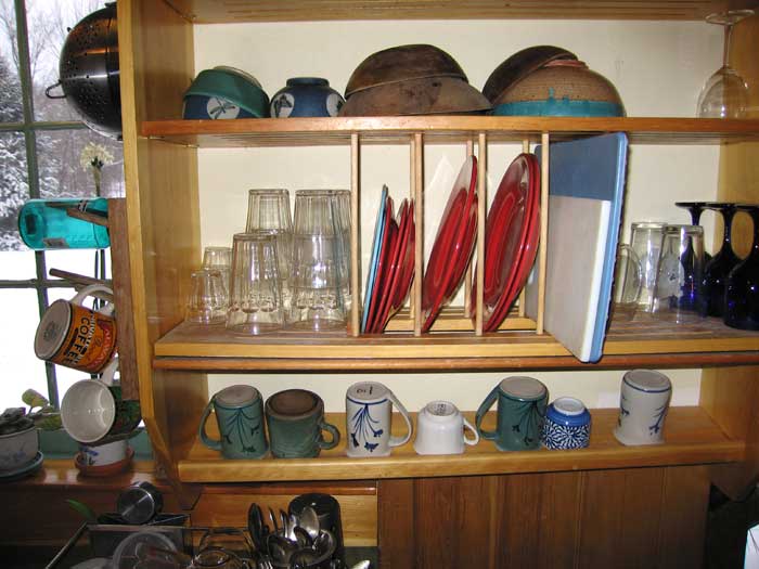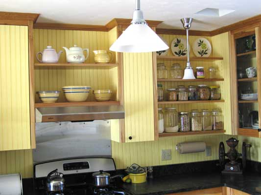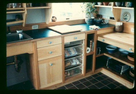Green Kitchens Plywood: We use no particle board. Our cabinet boxes are made from 3/4” birch Purebond plywood, which is made with a soy based adhesive rather than the usual urea-formaldehyde glues. Lumber: We are very interested in where the lumber that goes into our cabinets comes from. We want to use good quality wood, that has been harvested in sustainable ways. FSC certification is one way of addressing that. Right now we can get white oak, red oak, cherry, and maple in FSC, and other species can be special ordered. FSC lumber, which usually costs somewhat more than similar uncertified lumber, has chain of custody documentation which certifies that the wood has been sustainably harvested, and sometimes also that it was grown within 500 miles of where it will be used. We have a variety of local sources for hardwoods and softwoods where we have personal knowledge of the source. We use a lot of pine lumber, particularly beautiful eastern white pine, for drawers, shelves, and sometimes for drawer fronts and cabinet doors. We have a source in New Hampshire for FSI certified pine. This is beautiful and beautifully milled pine grown within about 200 miles of the yard where we buy it. FSI certification means that the forests where the lumber is cut are sustainably managed. We also offer recycled oak, heart pine, and chestnut. This is a complicated issue, with lots of trade-offs. We work closely with all our suppliers to find out where their wood comes from, whether it carries a label or not. Let's talk. Counters: We prefer natural materials for out counters. Most of our kitchens have some amount of wood counter, either slabs made in our shop, or commercially available butcher block with an oil finish. We like stone counters, particularly around a sink or next to a stove, and are partial to slate from Vermont quarries. We've also been using linoleum in places where a plastic laminate might be called for. Linoleum is a natural product, made from jute, stone dust, linseed oil and other materials, and makes an interesting counter, which is softer than laminate but quite tough in use. (click to Thoughts on Counters) Finishes: We offer several types of finishes. Our default finish has been an oil-based satin polyurethane, which is easy to apply, tough, durable, and cost effect, but not particularly “green”. We have worked extensively with water based varnishes. So far, we've found none that are as tough or good looking as the oil-based poly. We feel this is a suitable finish for insides of cabinets and for drawer boxes, but not for the parts of the cabinetry that you will be looking at. Even so, more coats are needed to get decent protection. We are now offering tung-oil-based finishes from Sutherland Welles. These are beautiful, low VOC oil finishes made in a variety of formulations. This company has put a lot of thought into developing finishes that are tough and have low VOC levels. We're still learning about these finishes. They may require a bit of annual upkeep, and there may be a small additional charge. Recycling: One of the best ways to save money and have a more green kitchen is to reuse elements from your existing kitchen, or from other sources. We've often used nice old sinks or other appliances. An old counter can sometimes find a new home. A old table can become an island. An old “hoosier” cabinet from the '20s can replace a segment of new cabinetry. Reuse of this kind can be a green choice. But it also saves money, and adds an element of variety and interest to a kitchen that all new, totally matching cabinetry cannot provide. In these things, though, layout comes first. Use that old sink when it really fits the design. Design Issues:Getting the right materials is only part of it. Put as much thought into the design as into materials choices. Here are some considerations that often come up in our projects. Compact Design: We think a compact design saves cost, uses less space, and requires less material and labor to construct. As with building a new house, a smaller, smarter design is more ecological than a huge kitchen with all the ecological bells and whistles. Appliances: Choose efficient, low energy use appliances. Extra large stoves, sinks, and refrigerators are very popular at the moment. Usually the more conventional sizes will work fine, and conserve your valuable counter space. Also look for appliances which will be reliable, and can be easily repaired – that's part of ecology, too. Dish Drainers: We've been making these “wonder no-dry” dish drainers for many years. The idea is, you wash and rinse the dishes, then put them away wet. The excess water drips back into the sink. It saves space, and makes hand washing easy. Though many customers also have a dishwasher, it really is about as fast to hand wash as use a machine. In a very small kitchen, with minimal storage, eliminating the dishwasher can be one way to find crucial storage space. No electricity required. Open Shelves: It's good to use green materials, but also to use less material. Open shelves is one way to simplify your kitchen, and reduce the material used to build it. Of course, it saves money. A walk-in pantry is another device that does this. Building cabinets in place, or eliminating unnecessary elements (such as some cabinet backs) are other ways to reduce the total amount of materials consumed in your kitchen project. Recycling, etc: Make sure you provide for composting, recycling, and the other “ecological” chores we all now do.